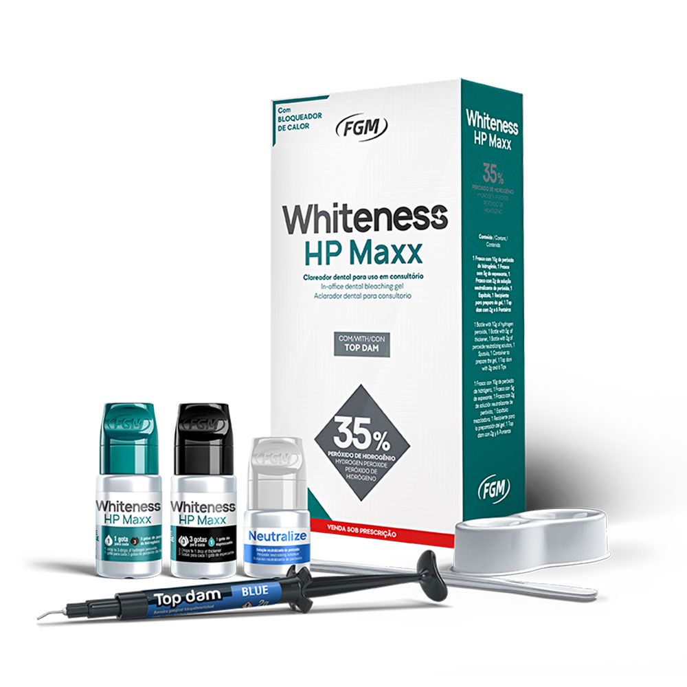 Gel clareador à base de peróxido de Hidrogênio na concentração de 35%. Apresentação em duas fases, peróxido e espessante. Troca de gel. Aplicações por sessão de clareamento: 3.